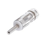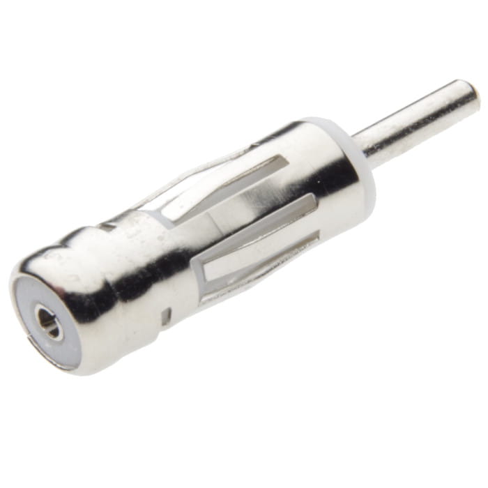 Metalowy adapter przeznaczony do radia samochodowego, pozwalający na konwersję złącza antenowego ze standardu ISO na DIN. Długość urządzenia wynosi 4 cm.