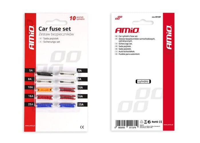Komplet cylindrycznych bezpieczników samochodowych (rurkowe), które chronią instalację elektryczną pojazdu przed uszkodzeniem. W zestawie znajduje się aż 10 bezpieczników o różnych wartościach (od 5A do 25A). Długość bezpieczników wynosi 24mm.