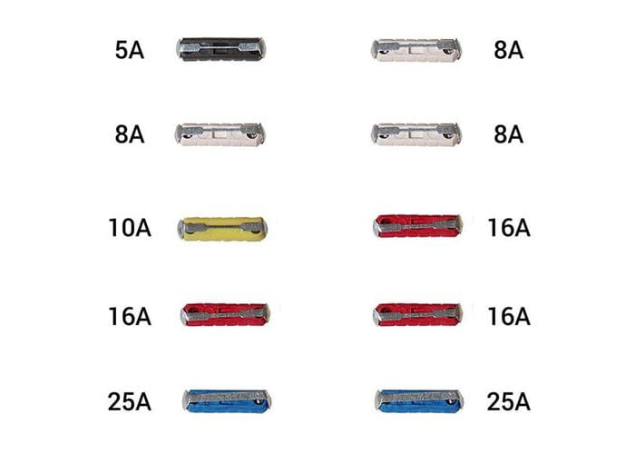Zestaw 10szt. bezpieczników samochodowych cylindrycznych (rurkowych) chroniący instalacje elektryczne pojazdów przed ich uszkodzeniem. Długość bezpiecznika 24mm.