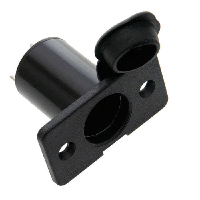 Obsługuje zarówno napięcie 12V, jak i 24V. Gniazdo posiada gumową zatyczkę bryzgoszczelną, która chroni przed zachlapaniem czy zalaniem wodą oraz różnego rodzaju zanieczyszczeniami typu kurz lub pył.