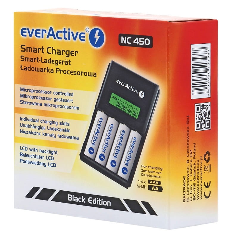 Nowoczesna ładowarka procesorowa marki EverActive model NC-450 umożliwiająca ładowanie do czterech ogniw AA lub AAA naraz. Urządzenie wyposażone jest w zabezpieczenie przed przegrzaniem akumulatorów oraz funkcję detekcji uszkodzonych ogniw.