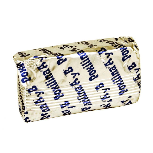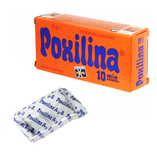 Klej epoksydowy marki "POXILINA", tak zwana masa epoksydowa dwuskładnikowa. Po otwarciu opakowania, masę możemy odciąć (jeśli nie chcemy zużywać całego kleju na raz) do preferowanego przez nas rozmiaru, po czym odciętą masę trzeba dobrze "wymieszać", wygnieść tak aby dwa składniki zostały dobrze wymieszane. Po tym zabiegu mamy 10 minut zanim masa zacznie wysychać.