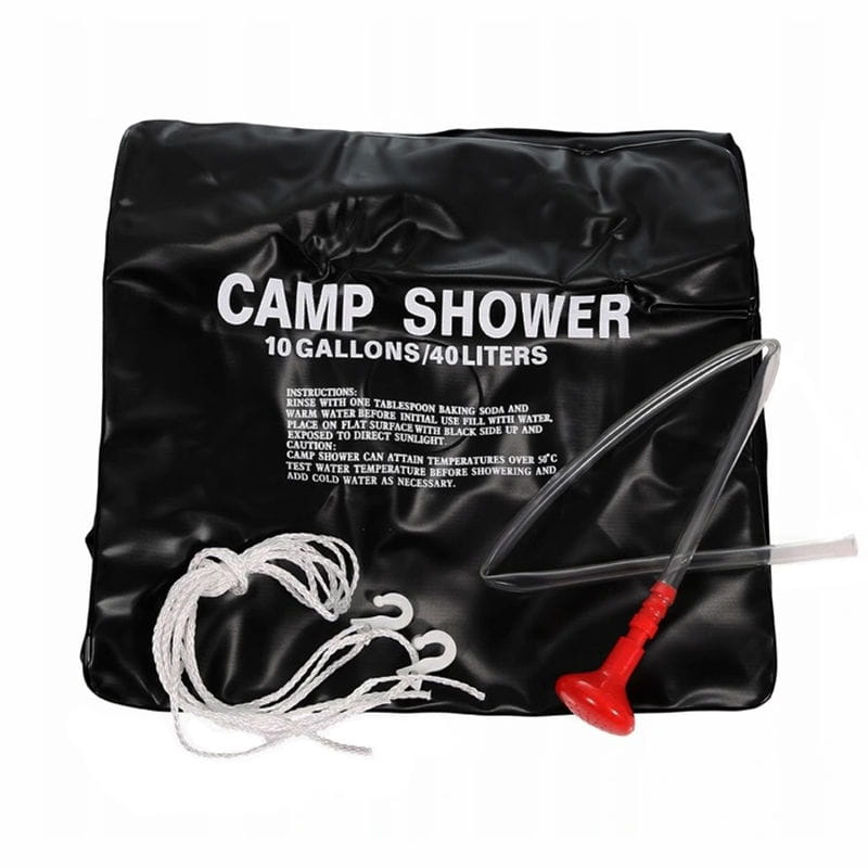 Podwieszany prysznic turystyczny o pojemności 10 galonów/40 litrów. Jest to przenośny zbiornik na wodę, który do podgrzania płynu potrzebuje wyłącznie energii pochodzącej z promieni słonecznych. Dzięki zastosowaniu czarnego tworzywa, produkt doskonale pochłania energię, a tym samym woda szybciej się nagrzewa. Po wszystkim zbiornik możemy złożyć do niewielkich rozmiarów. W zestawie znajduje się słuchawka z wężykiem oraz sznurki z haczykami do zawieszenia.
