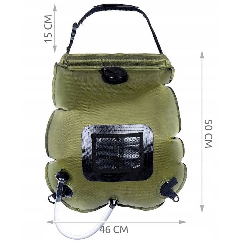 Podwieszany prysznic turystyczny o pojemności wynoszącej 20 litrów. Jest to przenośny zbiornik na wodę, który podgrzewany jest za pomocą promieniu słonecznych. Zastosowane tworzywo sztuczne powoduje, że prysznic świetnie pochłania światło, a tym samym woda szybko nagrzewa się. W komplecie z wężykiem zakończonym słuchawką oraz wygodną, zapisaną rączka do zawieszenia.