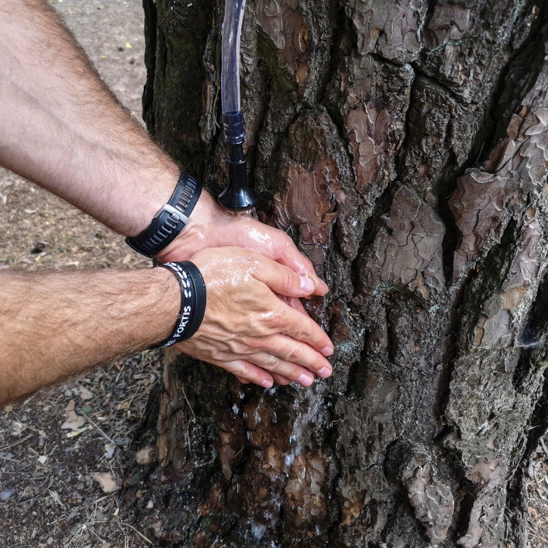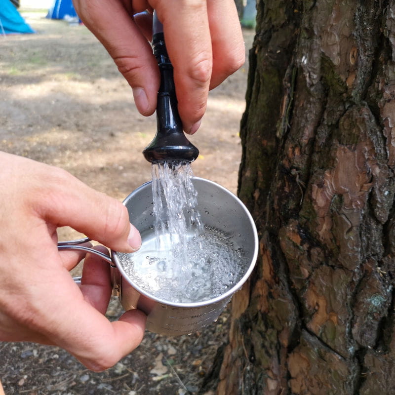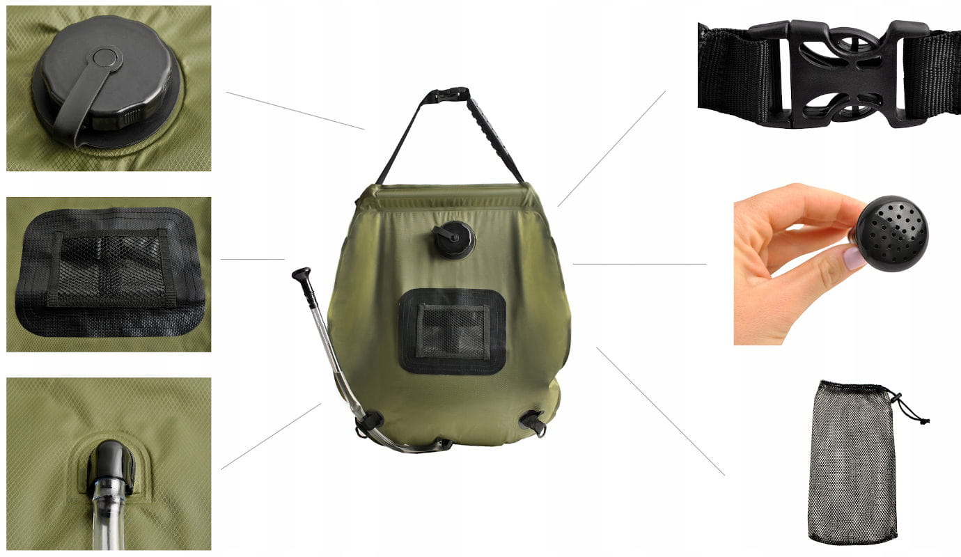 Złożony worek jest lekki i zmieści się do każdego plecaka. Z boków znajdują zaczepy na słuchawkę prysznica, a z przodu naszyto podwójną kieszonkę na przybory toaletowe: szampon, żel czy pastę do zębów. Z tyłu znajduje się termometr, który pomoże ocenić temperaturę wody. Długo wystawiony na bezpośrednie słońce, może przekłamywać wyniki.