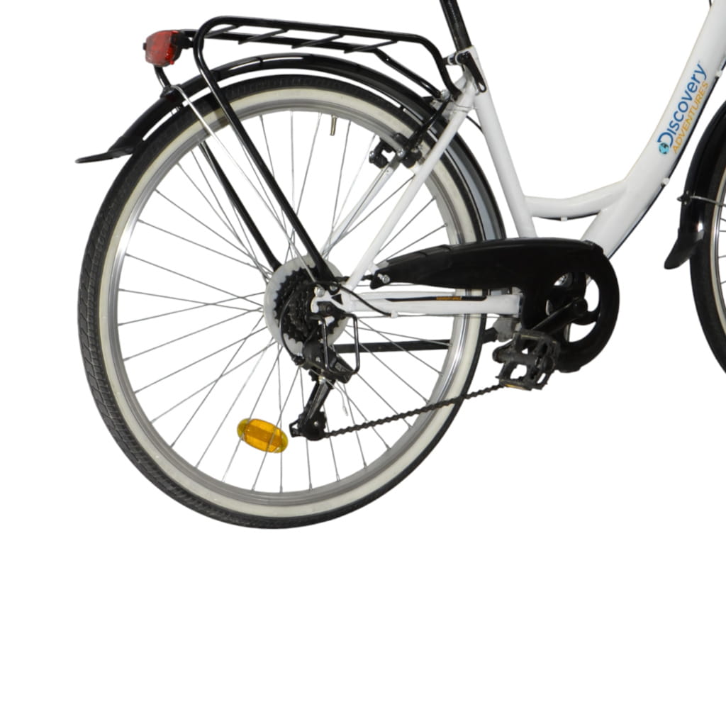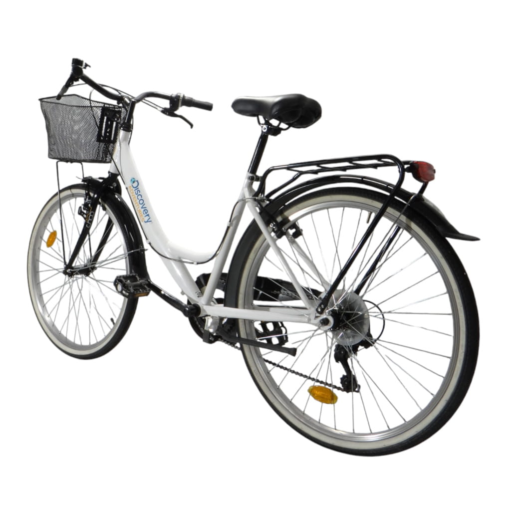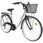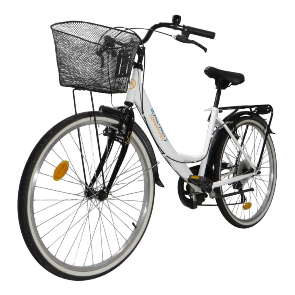 Biały kolor ramy w połączeniu z klasycznym designem nadaje rowerowi ponadczasowy charakter. Rower wyposażony jest w 6-biegową przerzutkę zewnętrzną, co umożliwia płynną zmianę biegów w zależności od terenu. Hamulce V-brake zapewniają skuteczne hamowanie w każdych warunkach. Dodatkowym atutem są praktyczne akcesoria takie jak koszyk, błotniki, osłona łańcucha, oświetlenie oraz stopka, które zwiększają funkcjonalność roweru.