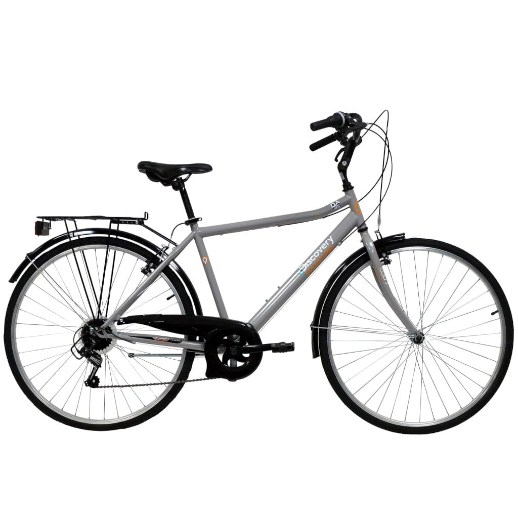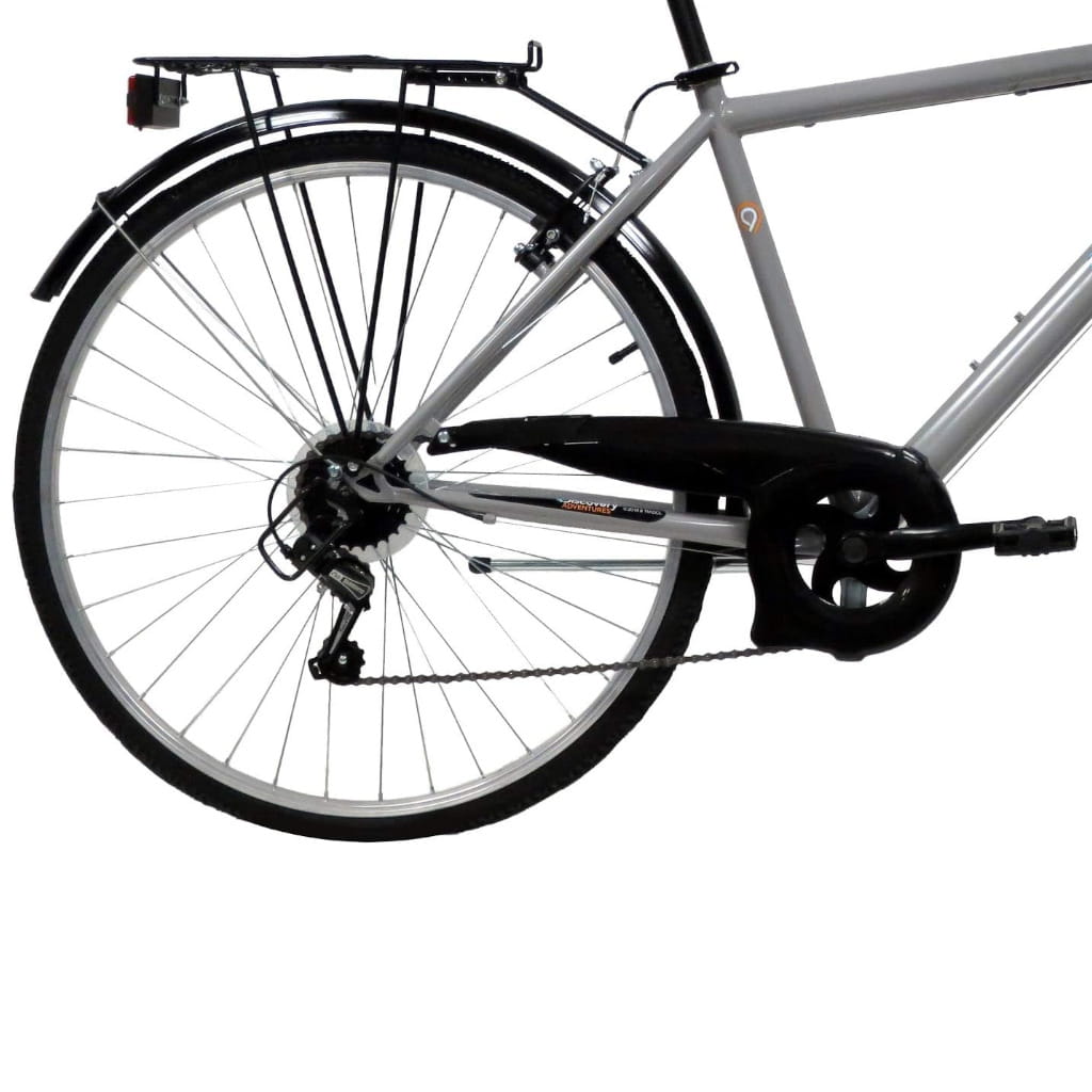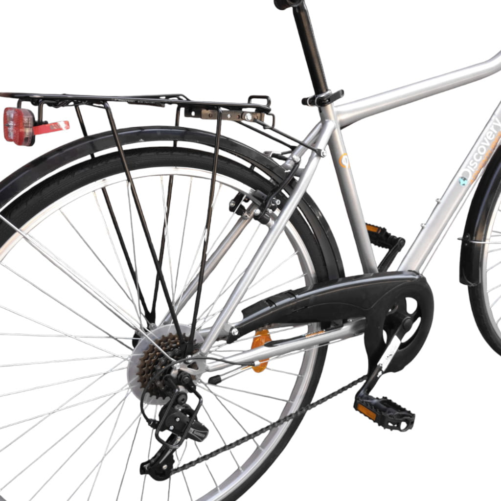 Odkryj komfort jazdy na rowerze Discovery 28" z stalową ramą, 6 biegami Shimano i stalowym bagażnikiem o nośności 25kg.