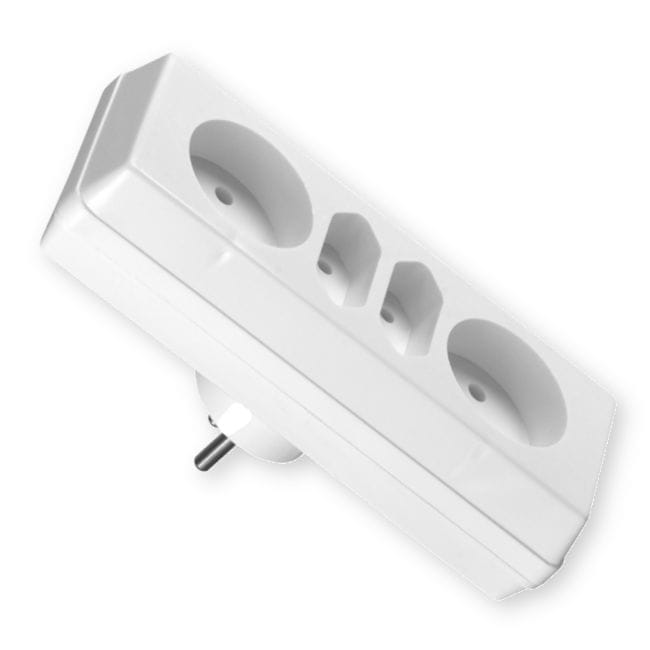 Rozdzielacz sieciowy w jednolitej obudowie, z jednym wtykiem (bez bolca uziemiającego) oraz 4 gniazdami (2 okrągłe, 2 płaskie). Rozdzielacz bez bolca uziemiającego.