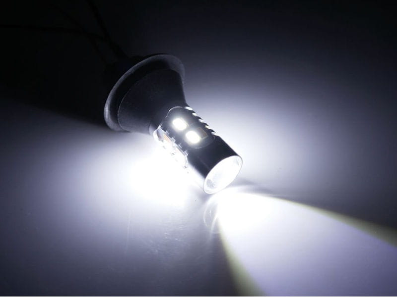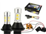 Samochodowe żarówki LED montowane w miejsce standardowych żarówek kierunkowskazów z mocowaniem W21W/T20. Podczas normalnej jazdy żarówki świecą na biało, natomiast przy włączonych kierunkowskazach migają na pomarańczowo. W komplecie z dwoma rezystorami usuwającymi błąd spalonej żarówki w samochodach z CANBUS.