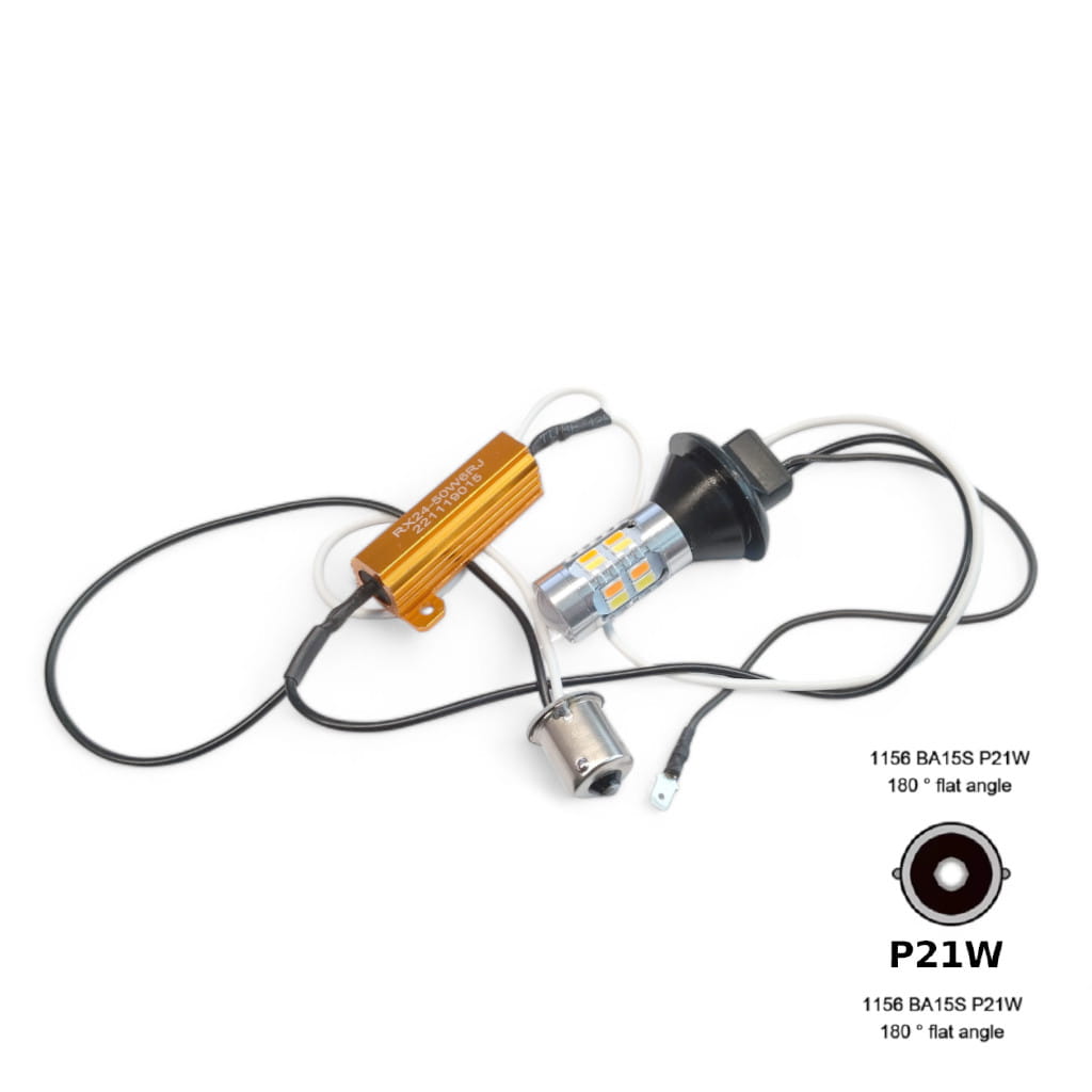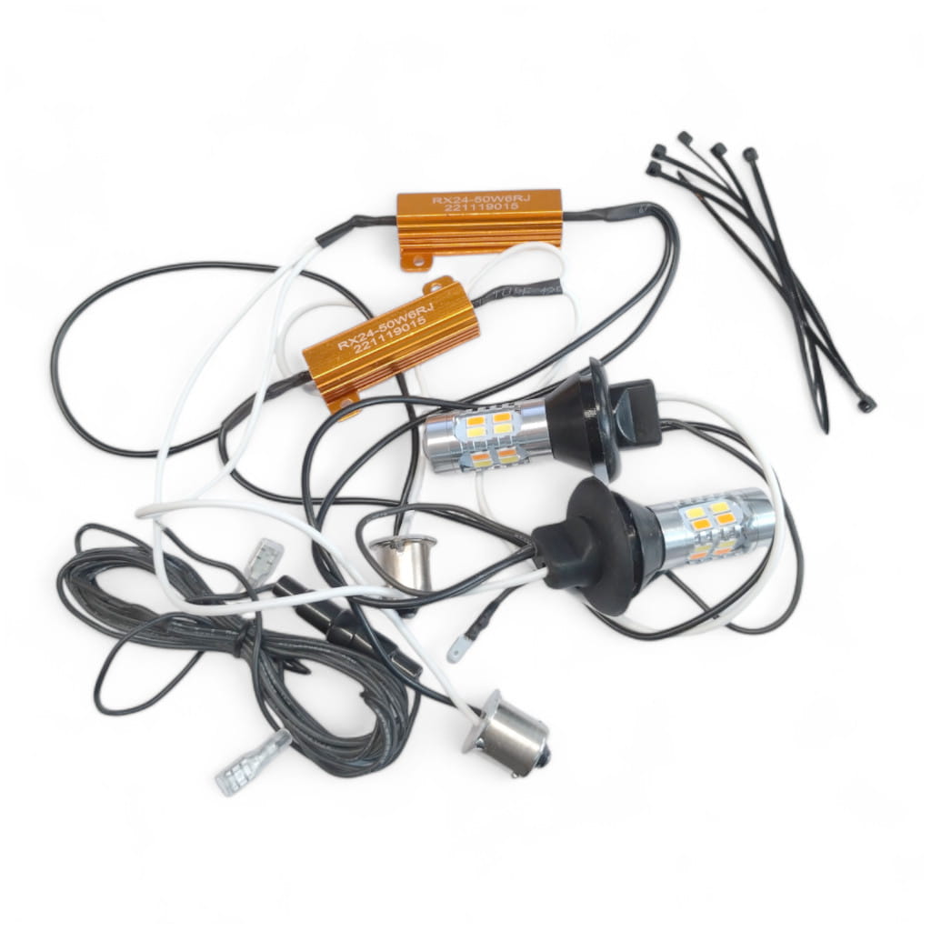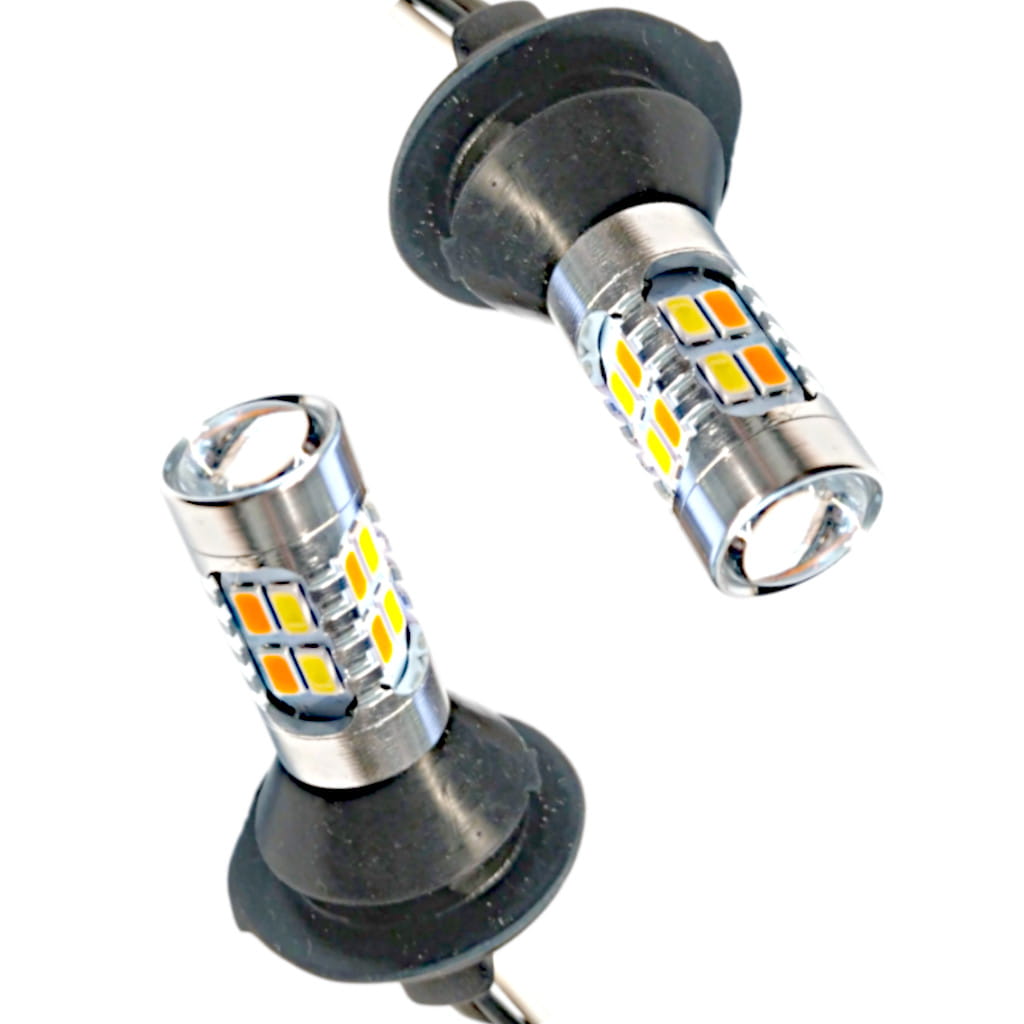 Dwukolorowe światła dzienne do samochodów, oparte na żarówkach LED z diodami 5730 SMD. Podczas normalnej jazdy świecą ładną, białą barwą światła; z kolei przy włączonych kierunkowskazach świecą pulsacyjnie na pomarańczowo. Montowane w gnieździe P21W kierunkowskazu. W komplecie z dwoma rezystorami usuwającymi błąd spalonej żarówki w pojazdach z Canbus, automat oraz okablowanie.