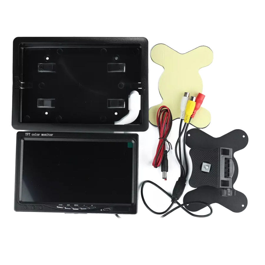 Kompletny zestaw kamery cofania wraz z monitorem LCD o przekątnej ekranu 7", dedykowany głównie do większych pojazdów mechanicznych, zasilanych napięciem 12V lub 24V. W zestawie z akcesoriami montażowymi.